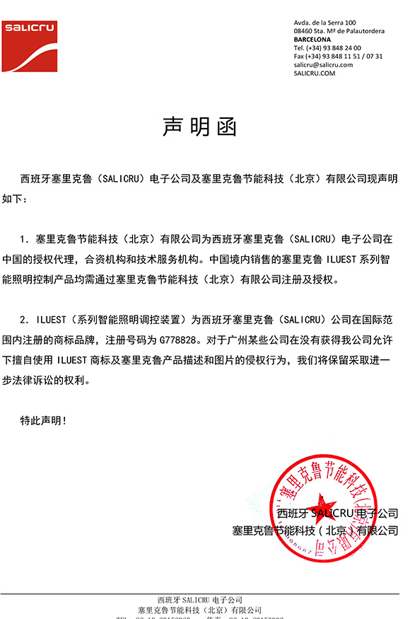 本网站为塞里克鲁(SALICRU)公司国内官方网站,本公司拥有ILUEST智能照明调控系统国际注册及专利权。国内所有与塞里克鲁ILUEST系列智能照明调控产品有关项目,均需经过本公司注册及备案。